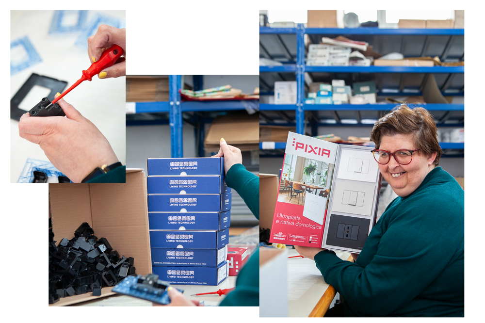Per Pixia, anche la fase di confezionamento diventa parte del progetto. I box di esposizione vengono realizzati in collaborazione con Fondazione IREA, cooperativa che coinvolge ragazzi con disabilità.