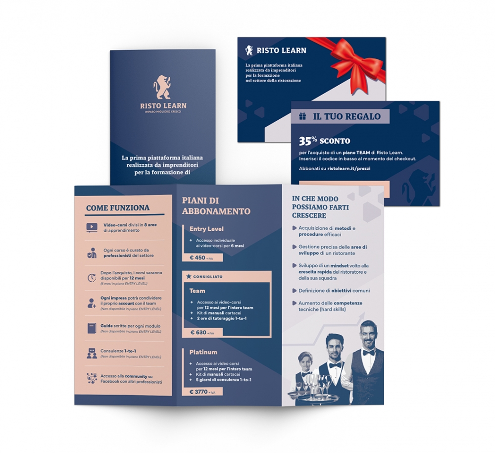 A supporto di ciò, sono stati progettati alcuni strumenti di vendita, tra cui un pieghevole di presentazione del corso e un coupon omaggio utilizzabile seguendo un particolare sistema di referral messo in piedi.