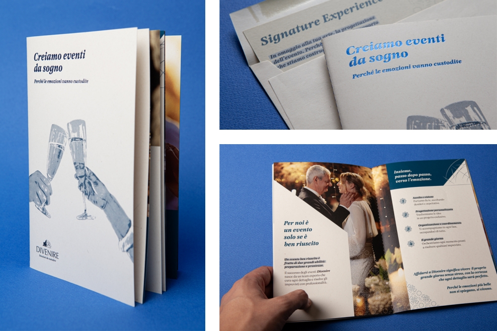 Il primo strumento di comunicazione in cui il progetto Divenire ha trovato piena espressione è stato la brochure di presentazione. Un racconto chiaro, pensato per i diversi pubblici e per emozionare attraverso il linguaggio, le immagini e i materiali. Dalla scelta delle carte alle lavorazioni pregiate, ogni dettaglio è studiato per trasmettere l'impressione di cura e alti standard, non solo alla vista ma anche al tatto.