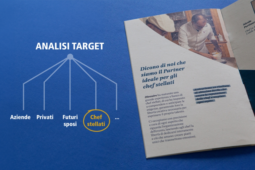 Per gli chef stellati sono stati ideati strumenti mirati, pensati per lasciare il segno e trasmettere con chiarezza l’ambizione di Divenire. Una brochure dedicata ne racconta i benefici concreti della collaborazione, mentre un coupon personalizzato presenta un’offerta esclusiva. A completare il percorso, un regalo speciale: uno specchio con cornice in legno incisa con un messaggio simbolico di impegno e condivisione di intenti: “Tu ci metti la faccia, riflettere la tua eccellenza è il nostro impegno più grande”.